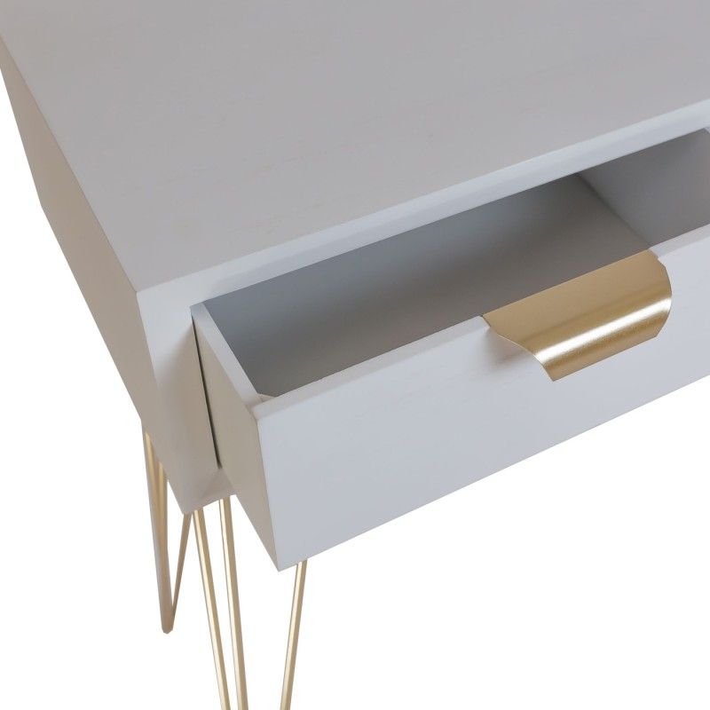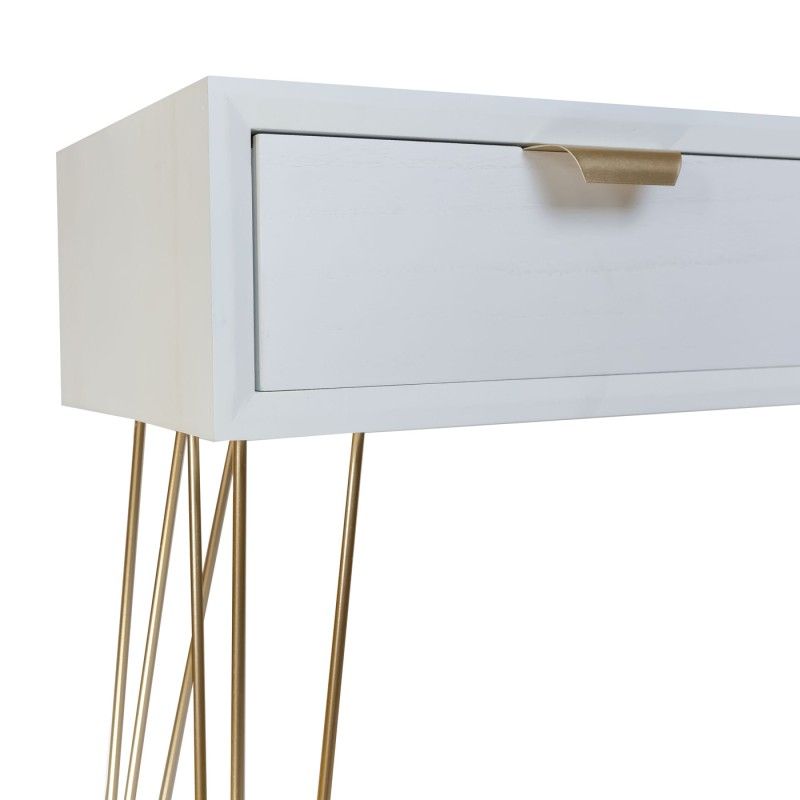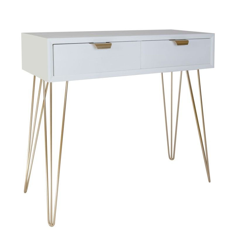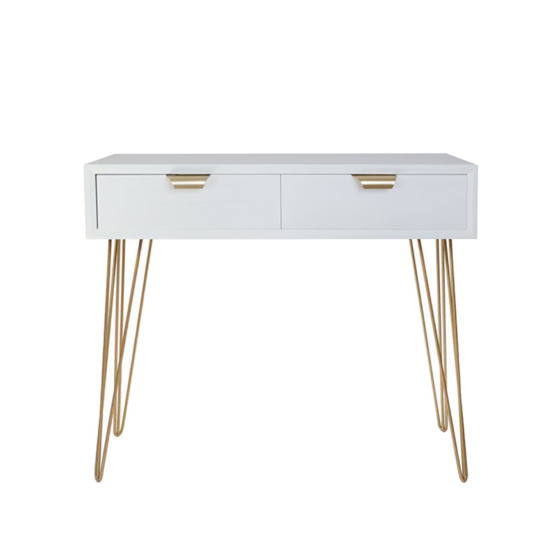 Consola com duas gavetas em mdf branco e pés em metal dourado de 90x80cm. Um design exclusivo para os amantes do estilo glam que vão virar a cabeça. A consola mais bonita, agora está também em branco. Escolha uma consola que vai trazer elegância e funcionalidade para a sua casa. Sem dúvida, vai ser a peça chave da sua entrada. Um protagonista indiscutível!