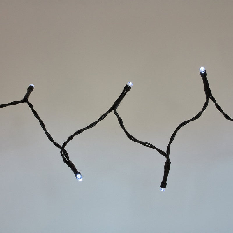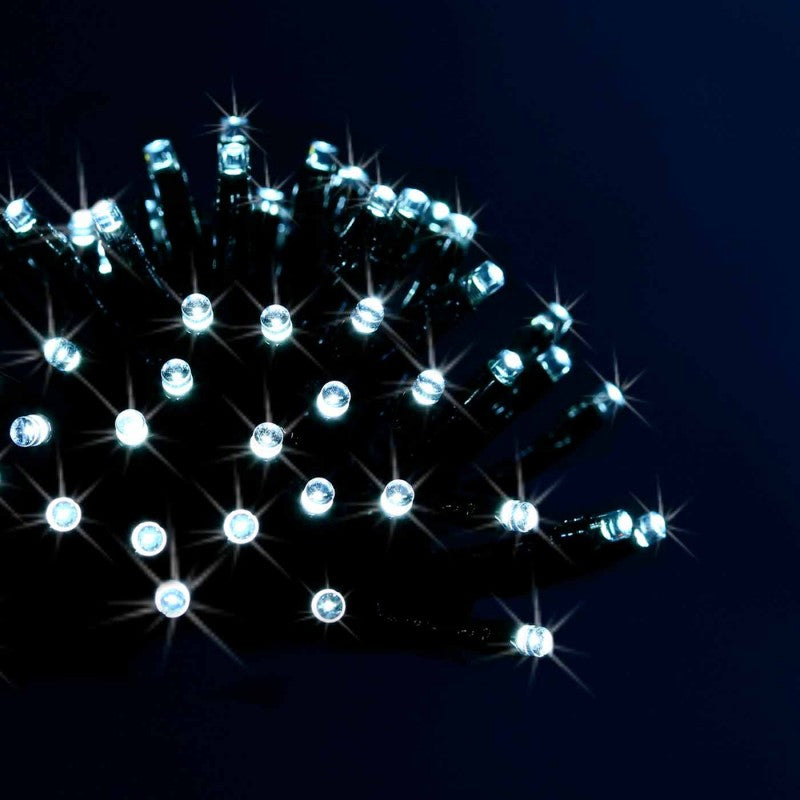 Grinalda em cobre e pvc com 96 LEDs brancos frios. Uma grinalda útil e confortável que pode programar para ligar automaticamente. Vai ficar incrível na sua entrada, iluminar o seu terraço ou deixar a sua árvore com aquele destaque que estava procurava.