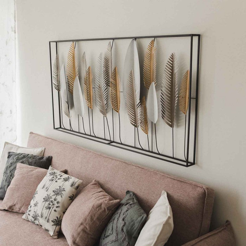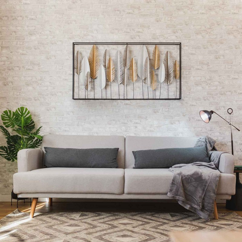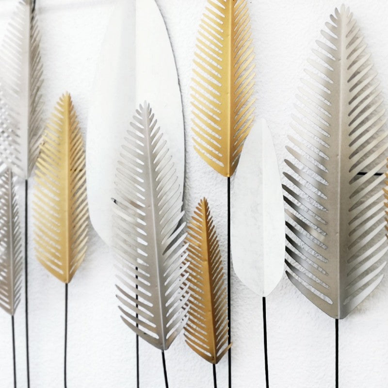 Folhas de metal em formato de decoração de parede prata, ouro e branco Se quadros ou espelhos não são sua praia, é uma alternativa perfeita.